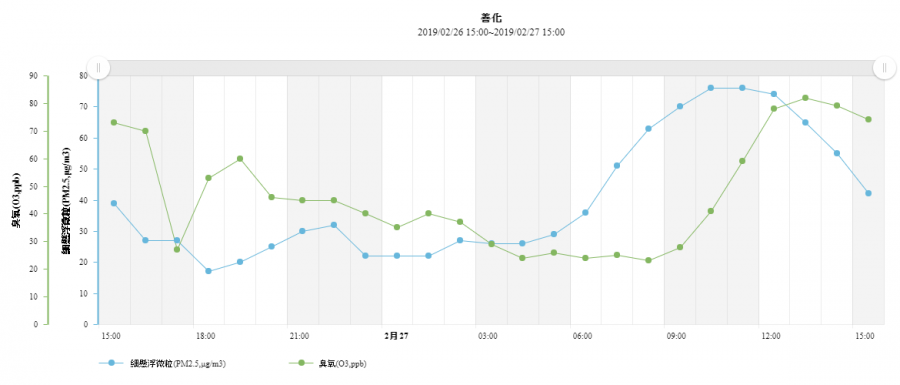 從下圖可以看到,因為空氣中的 PM 2.5 偏高,空汙粒子夾帶的化學物體在日照越來越強烈後,臭氧濃度 (綠線) 一路飆升,在中午 12 時左右就超過了環保署訂義的安全門檻 (65ppb)。