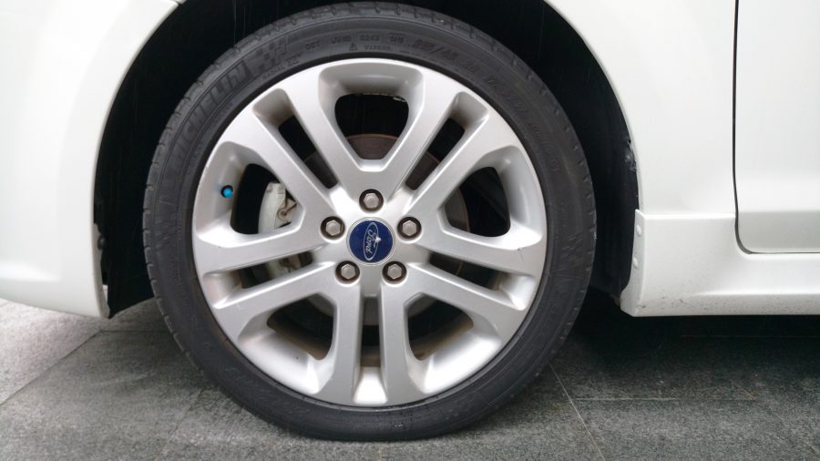 繞著輪胎看可以看到「 三碼數字 / 兩碼數字 一碼英文 兩碼數字 」的資訊,就是這條輪胎的規格,像這條輪胎「215 / 55 R17」。