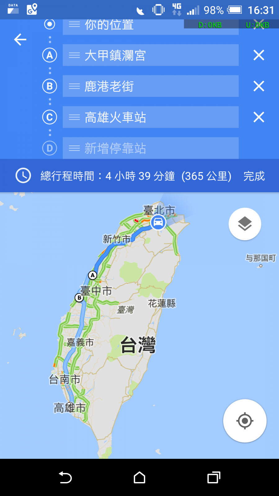 「新增停靠站」最多可以新增 8 個停靠站(不含起點與終點),譬如從台北出發去高雄,沿途可以去大甲拜拜,然後再去鹿港老街逛一逛,如果還要新增停靠站,只要在最下面灰白的新增停靠站按一下,就可以新增,新增的點可以按著停靠站上下滑動就可以排列順序。