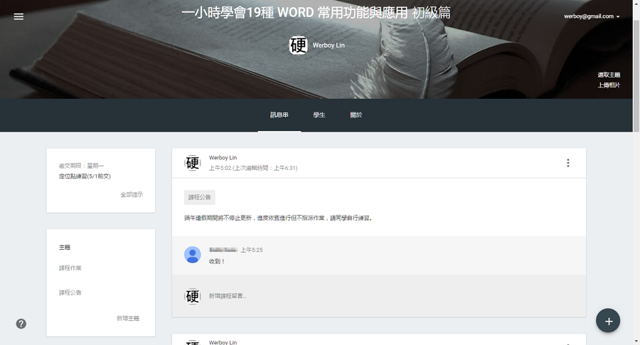 如果課程上有任何需要向學生公告的部分,利用公告功能除了能在 Google Classroom 課程平台上顯示之外,也會主動寄發 E-mail 通知所有學生。