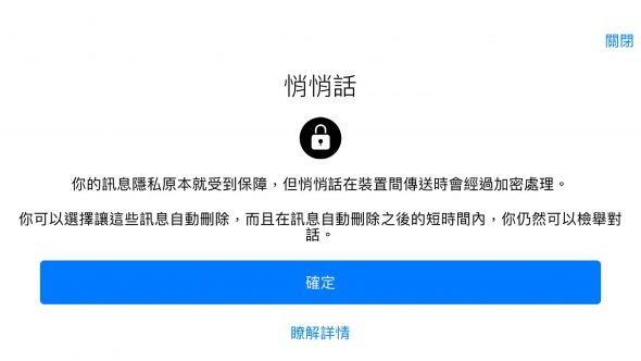 在這個聊天畫面中,你可以像一般對話一樣聊天,不同的地方在於這個對話視窗會限定裝置,除了目前使用的裝置看的到訊息之外,其他裝置就算登入相同的 FB 帳號無法悄悄話內容,聊天列表中也不會出現悄悄話的紀錄。