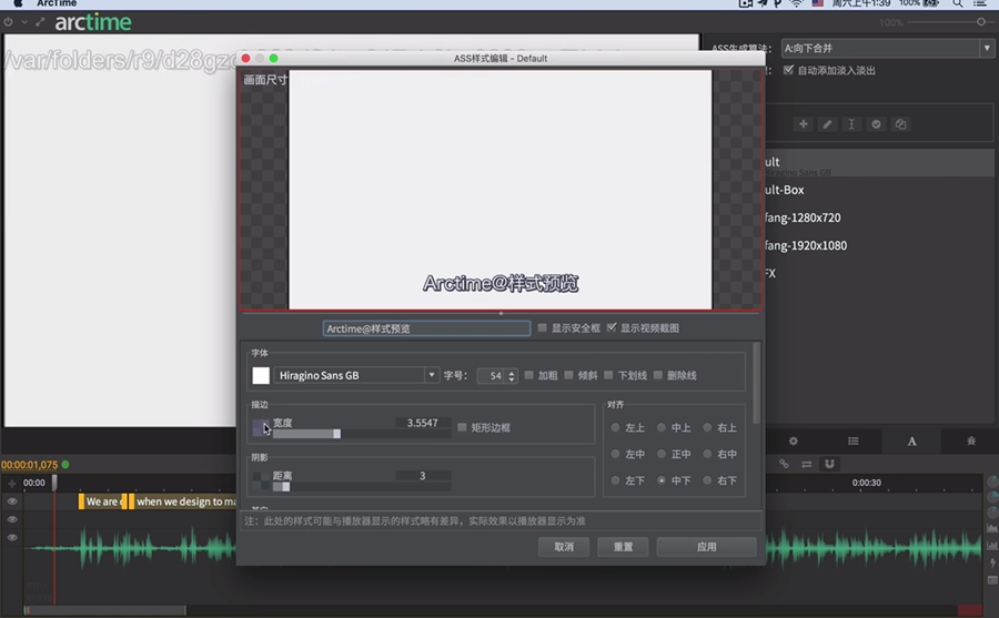 第四、放好字幕後 Arctime 會給予字幕適當的大小並且即時顯示在預覽畫面上。
