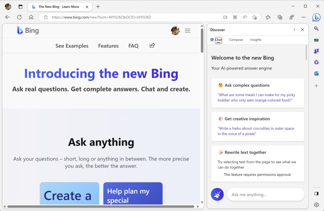 一周前微軟才宣布即將在 Bing 搜尋引擎內導入全新 AI 引擎並開放申請加入優先使用名單,如果你當時有申請加入的話,今天就可以開始體驗 Bing AI 的強大功能啦!和 ChatGPT 不同的是,微軟除了開放聊天型態的 AI 服務外,還免費提供了寫文 (compose) 功能。這篇文章要快速教你如何進入神秘的申請通道!