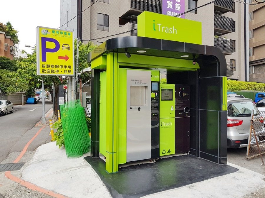 iTrash 在台北市設置第一個點是在台北市中正區臨沂街巷子內(確切位置),iTrash 設在停車場旁街角,iTrash 營運項目有垃圾收集與資源回收兩種,下圖左邊機器是垃圾收集機,右邊機器是瓶罐資源回收機,兩種都只能透過遊遊卡或一卡通才能使用。