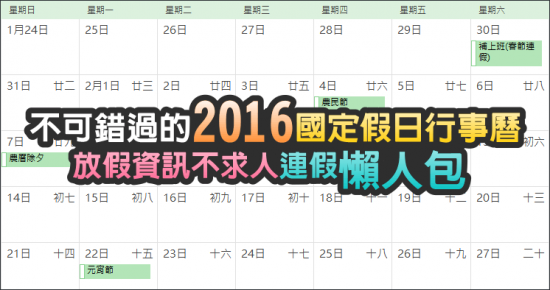 2016 國定假日行事曆匯入個人日曆,連假攻略大家準備好了嗎? 客座投稿 10 年前 2016 新的年度開始,大家知道有那些假期了嗎?雖然說早在去年就已經公布今年度的國定假日行事曆了,但是大家真的有記起來嗎?或是有加入自己的行事曆當中了嗎?若沒有的話趕快來加入,日後的假期就不用再上網搜尋,打開電腦或是手機就可以自己查看,或是來趕快規劃連假請假攻略,要放假、要出國都是得事先規劃的,搶機票也不能搶輸人唷! PC 用戶匯入 2016 …