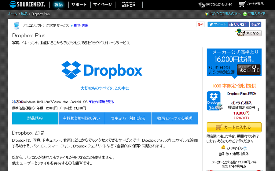 若在 Dropbox 官方網站購買 Plus 方案,年繳費用為 99 美元,大約台幣 3000 元,但在 SourceNext 一次購買三年,含消費稅折合台幣每年價格約為 1,959 元,節省超過 1000 元。如果你本身就是 Dropbox 的長期使用者,不妨考慮這個方案。