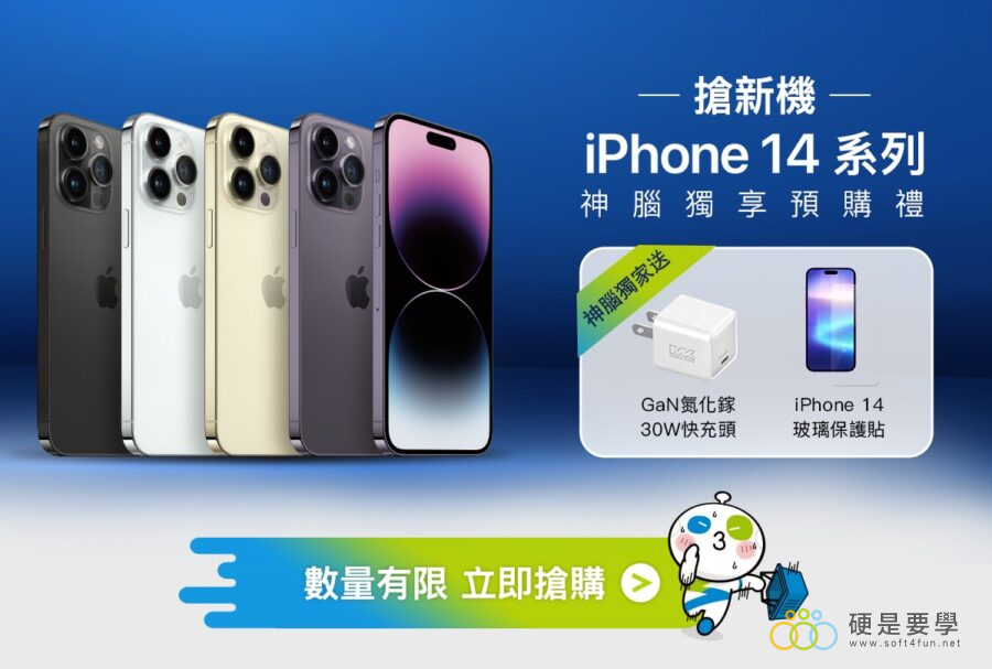 這次神腦的 iPhone 14 預購活動結合很多優惠,到神腦門市、網路商城預購可以直接獲得最高 2,000元回饋,還加送30W 充電器及保護貼服務,等於現賺 3,180 元!