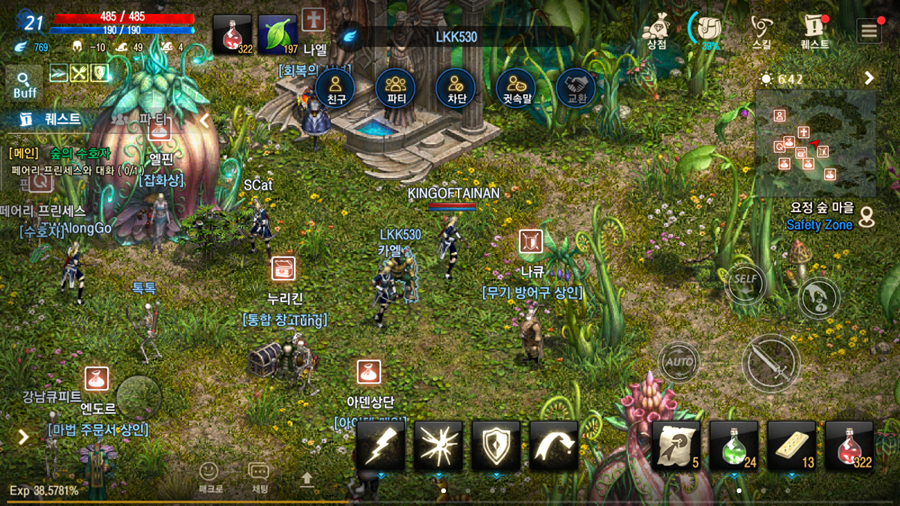 接下來會進行一連串的新手教學和任務獎勵,不難遊戲介面整個都是韓文,基本上如果沒有學過韓文是甭想看懂內容,一直點螢幕帶過就好。一開始系統會給你大量的紅色藥水和武器(妖精則會配給上萬支箭),所以不用擔心沒有武器的問題。