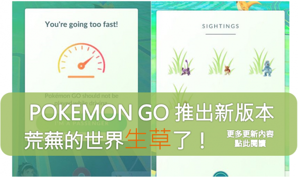 Pokemon GO 在台灣推出後今天第一次推送更新,有鑑於全球玩家越來越多,發生交通事故機率也越來越高,新版本中貼心的加入駕駛速度警示功能,提醒駕駛不要在行駛間遊戲。此外,在 Nearby 顯示附近精靈的功能中加入了用來比較精靈體型的「草」,iOS 版之前拿掉的省電功能又回來了,玩家可變更角色暱稱,繼續閱讀看更多更新細節。