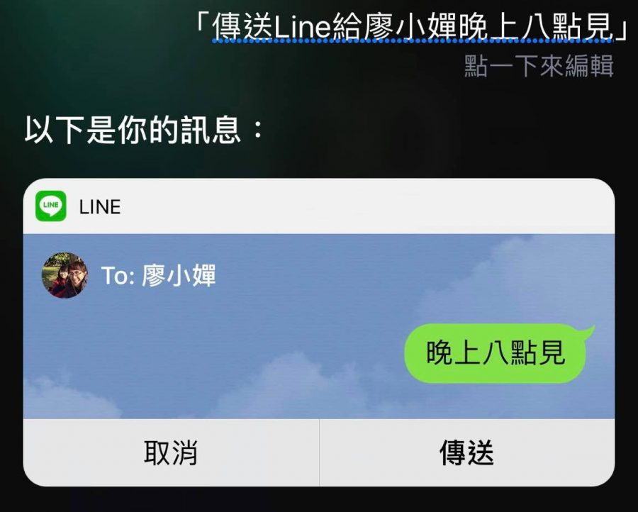 想透過 Siri 傳訊息給好友時,只要說「嘿 Siri,傳送LINE給(名字)(對話內容)」Siri 會問你要傳送什麼內容,再說出要傳送的內容即可。