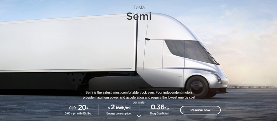 根據 Telsa 官網提供的資訊,Semi 的動力由 4 具獨立後置馬達驅動,在完全負重 (載重 36 噸) 的狀況下時速從 0 加速至 100 公里只需要 20 秒,最大行駛里程為 480 或 800 公里。在能源消耗上,行駛每英里僅消耗低於 0.2 瓦時電力。