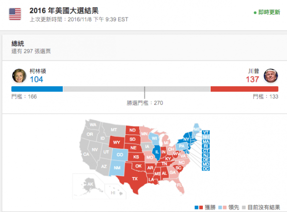 用Google等服務關注有史以來競爭最激烈的美國總統大選 ContentParty 9 年前 2016 美國總統大選即時選情就看這邊 第58屆美國總統大選稍早已在美國時間2016年11月8日開始進行投票,而先前包含Google、Facebook、Twitter除了持續呼籲所有美國公民出門投票,更藉由線上平台提供即時瀏覽候選人當前獲得選票情況。由於時差關係,預計所有開票結果將會在台灣時間11月9日下午三點左右確認。 …