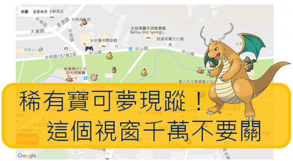 北投公園的快龍事件讓我震驚了!真的是震驚,那種像在朝聖的人潮和速度真的很誇張,但是你知道大家怎麼知道有快龍的嗎?最近很夯的寶可夢地圖就是其中一個關鍵。「大家找寶貝」是一個可以顯示附近有哪些寶可夢的寶可夢地圖服務,可以很方便的得知地圖上現在出現那些寶可夢,也能知道距離消失時間還有多久,如果又遇到稀有寶可夢的話,你也能馬上知道正確位置,配合 Pokemon GO 的 Insight 功能使用效果也不錯喔!