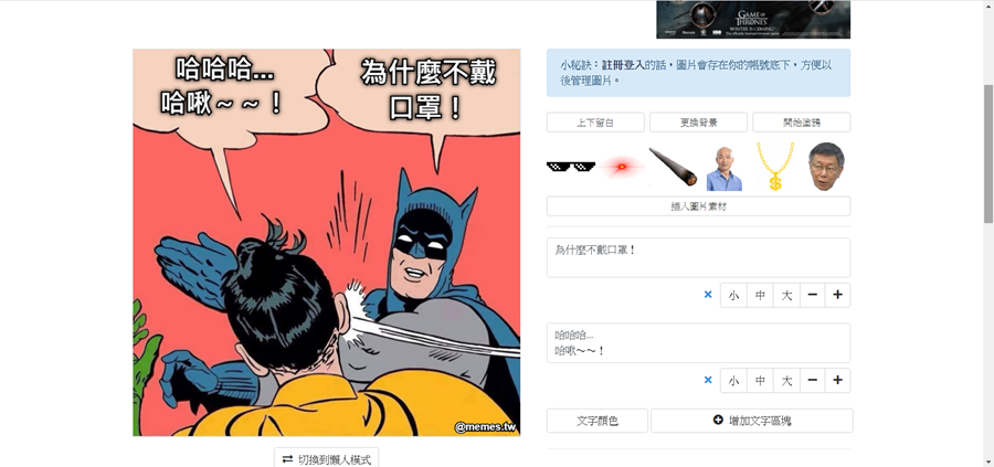 網站推薦 做梗圖超簡單,Meme 梗圖倉庫一站搞定所有設計需求 首頁科技網站推薦 作者/ Werboy - 2020 年 02 月 03 日 Meme梗圖梗圖倉庫梗圖產生器 刊登廣告? 點此聯絡 常看別人分享一些梗圖,他們到底是怎麼做的,哪來這麼多背景可用?其實不用擔心,透過 Meme 梗圖倉庫就可以找到很多素材讓你發揮創意,封面圖片也是透過這個產生器製作的,相當簡單喔!一起來製作看看吧! 梗圖倉庫裡面有非常多的圖片素材可用,點選手工或懶人編輯模式之後進入文字安排畫面。 這裡可以在圖上任意中插入圖片、素材或文字,也可以自行塗鴨或者從電腦上傳素材使用,都可以很自由的編輯。 設計完成之後移動到網頁下方就可以儲存圖片,但有時可能遇到人數太多儲存太慢,可以用截圖軟體直接把設計好的圖片擷取下來。 Meme 梗圖倉庫 Meme梗圖梗圖倉庫梗圖產生器 訂閱《手哥科科》YT,加入 5,000+ 位科技粉! 相關文章/報導 Werboy3C科技部落客,硬是要學共同創辦人,台灣部落客社群(TBC)共同發起人。熱愛發掘、體驗及分享各類科技產品。 Email:werboy@soft4fun.net 《手哥科科》YouTube 頻道 OpenAI 發布 AI 瀏覽器:ChatGPT Atlas (中文字幕/中英翻譯) #OpenAI #ChatGPT #Atlas22:16 Samsung Bespoke AI Hybrid四門旗艦冰箱正式登台 #手哥科科01:10 智慧遙控也能防霉?iCtrl新功能幫你年省4千元洗冷氣費用!還可以減少冷氣滋生霉菌!09:41 WiFi 訊號真的可以打三樓!TP-Link Deco BE85 #WiFi7 路由器實測11:24 電競玩家專屬!ROG #磁軸鍵盤 Falcata,8000Hz 輪詢率、千階超靈敏感應,專為電競玩家打造多種客製化設定,還能作為人體工學鍵盤 #COMPUTEX202504:47 留下一個評論 取消 發表評論: 請輸入你的評論! 姓名:* 請在這裡輸入你的名字 電子郵件:* 您輸入了錯誤的電子郵件地址! 請在此輸入您的電子郵件地址 網址: 在我的瀏覽器中保存我的姓名,電子郵件和網站,以便下次評論。 新文章使用電子郵件通知我。 Δ 網站搜尋 我們的頻道 手哥科科 (YouTube) 編董不雷 (YouTube) 敗3C買物市集 (買家電、3C) 天堂M大補帖 看更多新聞 新聞 短影音刷過頭?YouTube 提供限制選項,幫你節制不浪費時間 新聞 微星雙11購物節活動開跑、效能筆電享萬元折扣、購機加碼抽$11,111電子現金 新聞 割韭菜囉!LINE 推出 Premium 加值訂閱方案,每月 165 元可跨裝置備份、開分身 AI LLM 救星?DeepSeek 推出 DeepSeek-OCR,Token 節省高達 90% 生活日常 慶祝楊謹華奪影后,Uber Eats 送折抵券最高折 100 元 - 廣告 - 分享給朋友 FacebookTwitterPinterestWhatsApp
