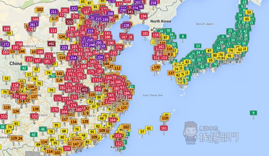 這幾天從日本回台灣除了都立冬還熱到死的氣候之外最不能適應的就是空氣污染的嚴重,相信各位也看到最近的新聞 PM 2.5 的值已經高到『紫爆』的危險等級,今天剛好在查相關資料的時候發現原來已經有強人收集好世界各地 PM 2.5 的數值並製作成網站來提供給大家查詢,玩了一下之後發現這網站功能實在是太強大的,對經常來往世界各地到處奔波的商務人士或是愛到處玩的朋友來說可是相當有幫助! …